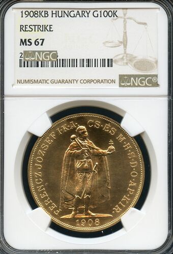 1908年銘のこの100コロナ金貨は1945年頃のリストライクで オリジナル1907年とは違いますが、MS67と素晴らしい状態です。 1900年初頭のハンガリーは、フランツ ヨーゼフの オーストリア、ハンガリー帝国で、王冠、笏を持って 立っているのもその皇帝、フラン…