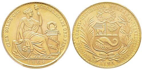 ペルー1964年100ソル金貨PCGS MS66を入手しました。 今月末に届く予定です。 大型の金貨で重さがなんと46.81g、1.3544オンスあります。 1950年〜1970年の間に発行され枚数は少なくはないのですが MS66というのはなかなかありません。 この100ソルはPCGSの鑑…