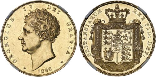 イギリス1826年ジョージ4世5ポンド金貨PF58です。 発行枚数わずか150枚、しかもプルーフのみ 本当に滅多に見ることができない大型金貨の一つです。 あのウナ&ライオン(400枚)より、もっと少ない発行枚数 ギニーからポンドへ移行した最初(厳密には2番目)…