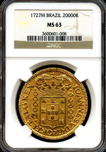 ブラジル1727年20000レイス MS63です。 先日1724年のMS62をご紹介しましたが今日は1727年のMS63 この20000レイス(16エスクード)は1724年から1727年の4年のみ発行 1724年が発行枚数が一番少なく入手困難ですが、他の年度も同様 NGCの鑑定数でもMS61以上は24…