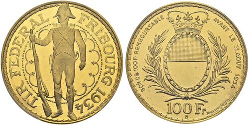 スイス1934年シューティングフェス フライブルグ100フラン金貨PCGS MS66+ スイスシューテイングフェスティバルの1934年金貨です。 発行枚数が2,000枚でなかなか出てきにくいものの一つ。 しかもPCGS MS66+ という素晴らしいグレードです。 1939年のルツェル…