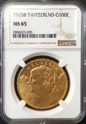 スイス1925年100フラン金貨NGC MS65が入荷しました。 発行枚数5,000枚ですが、100年近く経つと戦火で失われたり 紛失したりして残っている数が少なくなっていると思われます。 状態の良いものはさらに少なく、特に65以上のグレードは数えるほど。 コインはで…