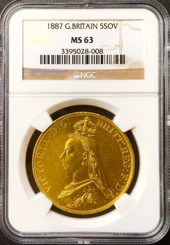 1887年に戴冠50年を期して発行されたジュビリーと呼ばれる5ポンド金貨 王冠をつけたヴクトリア女王の左向きの肖像と、裏面はセント ジョージが 馬に乗って竜を退治している場面です。 プルーフとMSの発行でMSは20,000枚発行されています。 しかしほとんどがM…