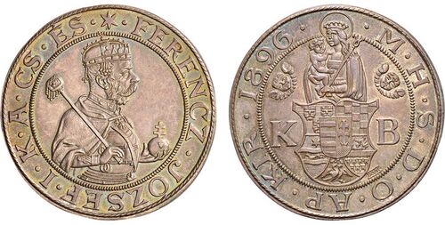滅多に見ることができないハンガリーの建国1000年のターラー銀貨です わずか、100枚のみの発行でこのMS65は最高の状態で残されてきたもの。 NGCでもこの下はMS61が2枚記録されているだけです。 オーブとセプターを持ったフランツヨーゼフの右向きの肖像。 裏…