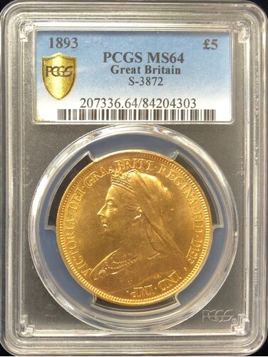 イギリス1893年ヴィクトリア5ポンド金貨PCGS MS64です。 ヴィクトリア女王が夫君を亡くし、しばらくの間公務もできず、以来このヴェールを 被って過ごされた肖像が描かれています。 とても人気のある5ポンド金貨の一つですが、いい状態のものが極端に少なく …