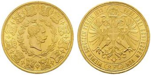 約1年ぶりにオークションに出てきました。 表はフランツ,ヨーゼフのまだ髪の毛がある肖像、月桂冠をつけてます。 その小さな肖像をぐるりと取り囲んだ12個の紋章。 1873年の単年度発行の金貨で、2フローリンの銀貨もあるようです。 銀貨でさえ雲上の女神の金…